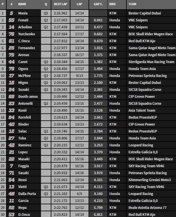 A l’abord des cinq dernières minutes, Can Öncü propose un 2’18.511, devant Arbolino et Fenati. Dalla Porta a un problème de sélecteur de vitesses. Le Turc pousse son avantage en 2’17.900. Mais pour rafler la mise dans cette FP3, il fallait rouler en 2’16.962 et c’est Masiá qui en est l’auteur. Fenati, Arbolino Yurchenko et Can Öncü ferment le top 5. Canet est huitième.