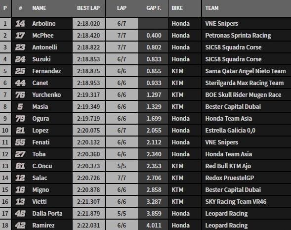 Du côté du leader du championnat, Arón Canet (Sterilgarda Max Racing Team) se qualifie en sixième position. L’ambiance n’est pas aussi joyeuse chez le team Leopard, Lorenzo Dalla Porta se retrouve en dix-septième position, devant son coéquipier Marcos Ramirez.