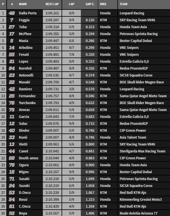 Le meilleur des KTM est Masaki qui pointe en quatrième position avec un temps au tour en 2.09.709s. Chute de Vietti dans le virage 5. A 5 min de la fin, Toba prend les commandes et accroche un chrono en 2.09.314s. McPhee est second avec un temps au tour en 2.09.355s , Arbolino est troisième en 2.09.451s. Antonelli part à la faute dans le virage 7 et chute lourdement. Ce dernier est resté accroché à la moto.