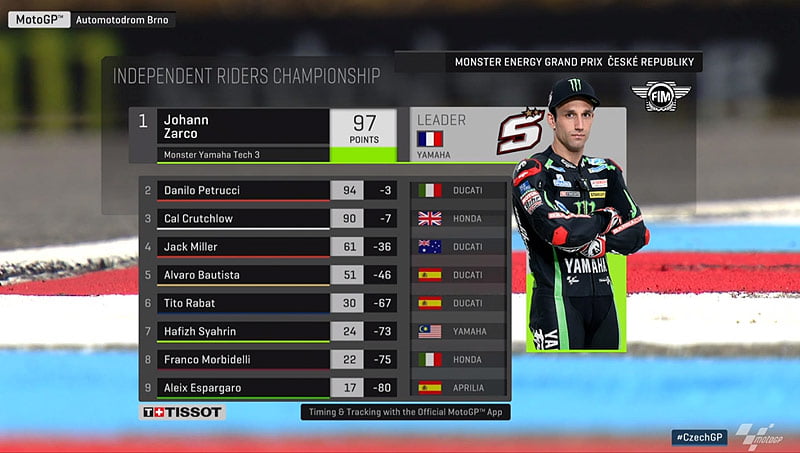 L’officiel Honda a cinq succès à son compte, Dovi deux soit autant que Por Fuera, Crutchlow en comptant un. Et Yamaha toujours aucun. Dovizioso passe troisième au général au détriment de Vinales et Johann Zarco glisse au sixième rang puisque Lorenzo le passe. Il reste néanmoins premier des indépendants avec Petrucci et Crutchlow grossissant dans son rétroviseur… Au bal des débutants, Syahrin reste devant Morbidelli pour deux unités.