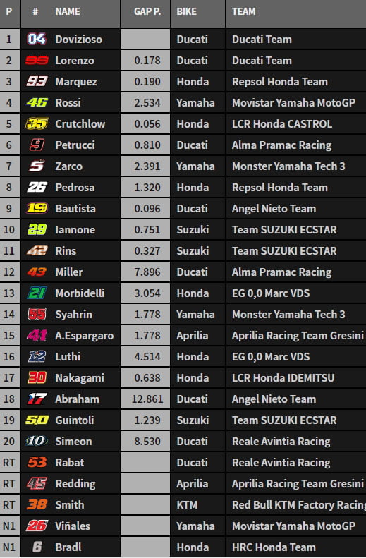 A 10 tours du but, le trio de la première ligne tente de s’échapper, ce que voit Crutchlow qui dépasse virilement Lorenzo pour garder e contact. Dovizioso prend les commandes devant Marquez et Rossi. Zarco est septième derrière Petrucci et contient les deux Suzuki. Morbidelli est troisième, devant Syahrin.