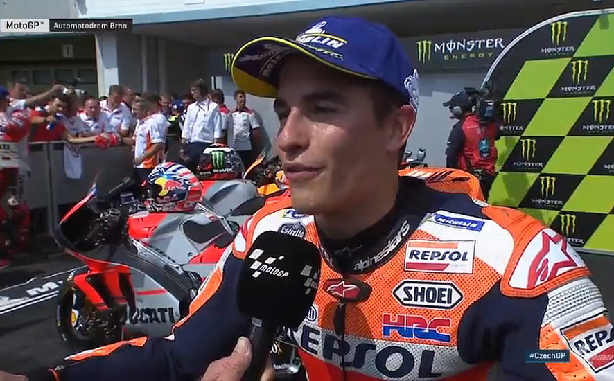 A peine descendu de sa Honda RC213V officielle après avoir obtenu la 3e place du Grand Prix de la République Tchèque à Brno, Marc Marquez s’est confié au micro du site officiel MotoGP.com.