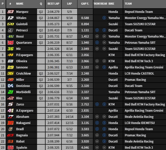Fabio Quartararo, Marc Márquez, Jack Miller, Andrea Dovizioso, Maverick Viñales, Álex Rins, Franco Morbidelli, Cal Crutchlow, Valentino Rossi et Danilo Petrucci restent donc pré-qualifiés pour la Q2