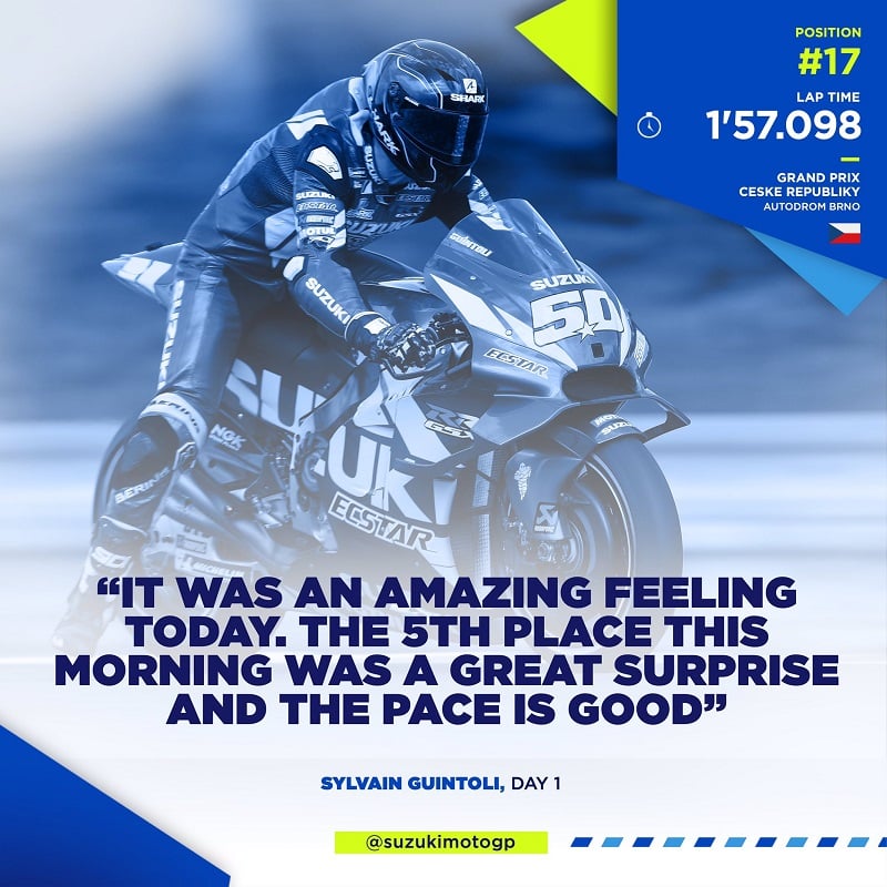Selon Sylvain Guintoli, « Ce fut une sensation incroyable que de revenir sur la GSX-RR, et j’ai senti que j’étais capable de me familiariser rapidement avec la moto. La 5e place de ce matin a été une très bonne surprise ! ».