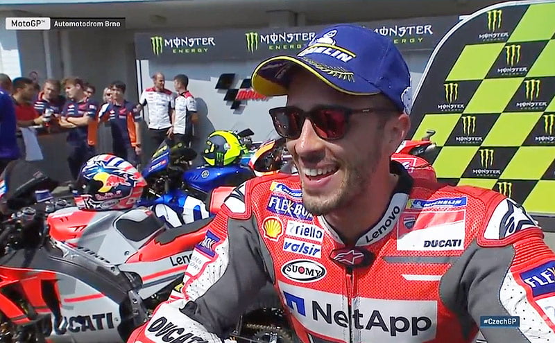 A peine descendu de sa Ducati GP18 officielle après avoir obtenu la pole position du Grand prix de la République Tchèque, la 6e de sa carrière en catégorie reine et la première depuis Sepang 2016, Andrea Dovizioso s’est confié avec une grande joie au micro du site officiel MotoGP.com.