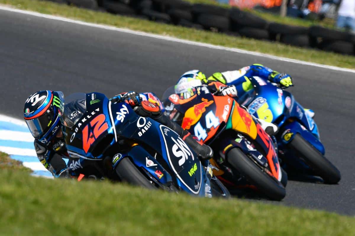 Deuxième service pour Francesco Bagnaia ! En Moto2, on est près de l’épilogue, d’autant plus que le rival à la KTM Miguel Oliveira ne semble guère conquérant. A Phillip Island, les deux hommes se sont neutralisés aux frontières du top 10. Mathématiquement, il faudra que le pilote VR46 ne concède pas plus de 14 points à son dauphin pour ceindre sa première couronne avant d’aller rejoindre le MotoGP et le team Pramac Ducati.
