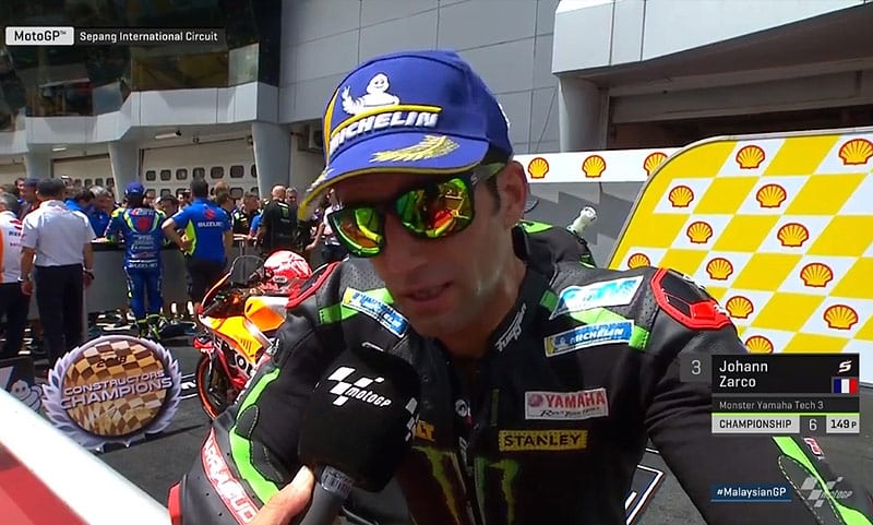 A peine descendu de sa Yamaha M1 satellite du team Tech3 après avoir rallié l’arrivée du Grand Prix de Malaisie en 3e position, c’est un Johann Zarco qui a fait une course solide et sans erreur qui s’est confié au micro du site officiel MotoGP.com.