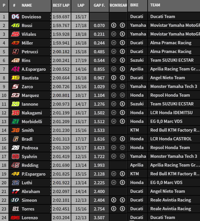 Toutefois, dans la dernière minute, Valentino Rossi se positionne 2e en profitant du sillage de Danilo Petrucci et Maverick Vinales remonte lui aussi à la 3e pl.ace.