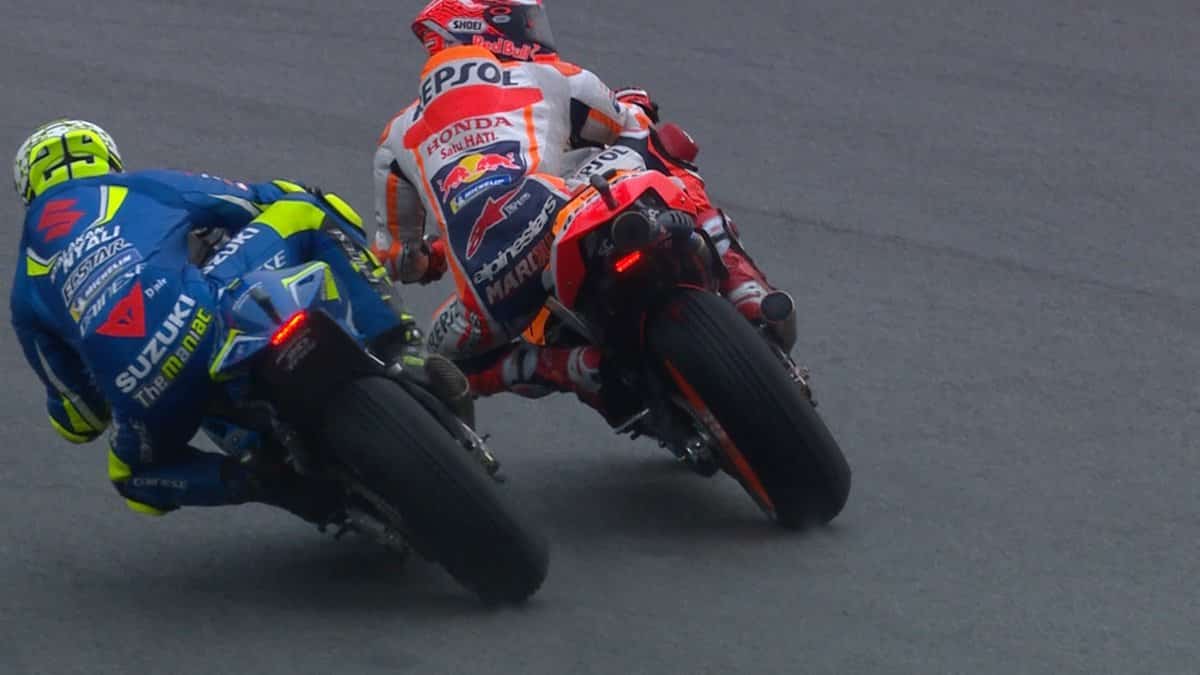 L’incident est arrivé au virage 9, lorsque Marc Marquez s’est retrouvé en pleine trajectoire au ralenti avec un Andrea Iannone se ruant sur lui au guidon de sa Suzuki. Et pour cause, Joe le Maniac était en plein effort. L’officiel Suzuki a commenté : « je suis en colère contre Marc. Il s’est mis sur mon chemin alors qu’il était lent et m’a fait perdre quatre dixièmes, ce qui signifiait pour nous le premier rang, il s’est excusé, mais il faut faire attention ».