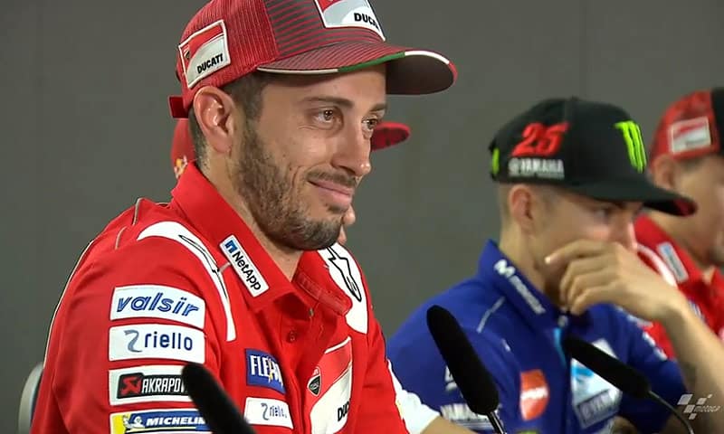 Andrea Dovizioso : « si je pense à l’année prochaine, je ne pense pas à battre en coéquipier. Je pense à coup sûr qu’il y aura Marc et d’autres très bons pilotes pour penser au championnat. Pour l’année prochaine, il y a un contrat, donc je ne sais pas pourquoi nous devrions parler de différents noms. Je ne peux rien dire. Ce n’est pas mon travail ».