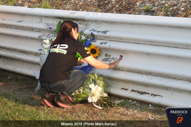 Comme chaque année, sa maman avait fait le déplacement du Japon pour déposer une gerbe de fleurs devant le rail, entre les virages #11 et 12,  en compagnie des membres de l’ancien team Technomag-CIP, à commencer par Alain Bronec, Gilles Bigot et Max Sabbatani.