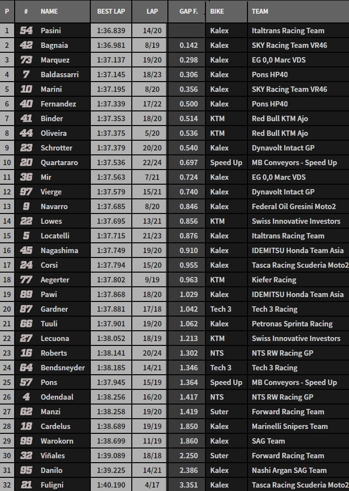 Derrière on trouve Xavi Vierge et Remy Gardner (Mistral M610, Tech 3 Racing), tout de suite dans le rythme, devant Mattia Pasini (Kalex, Italtrans Racing Team) et Miguel Oliveira (KTM, Red Bull KTM Ajo).