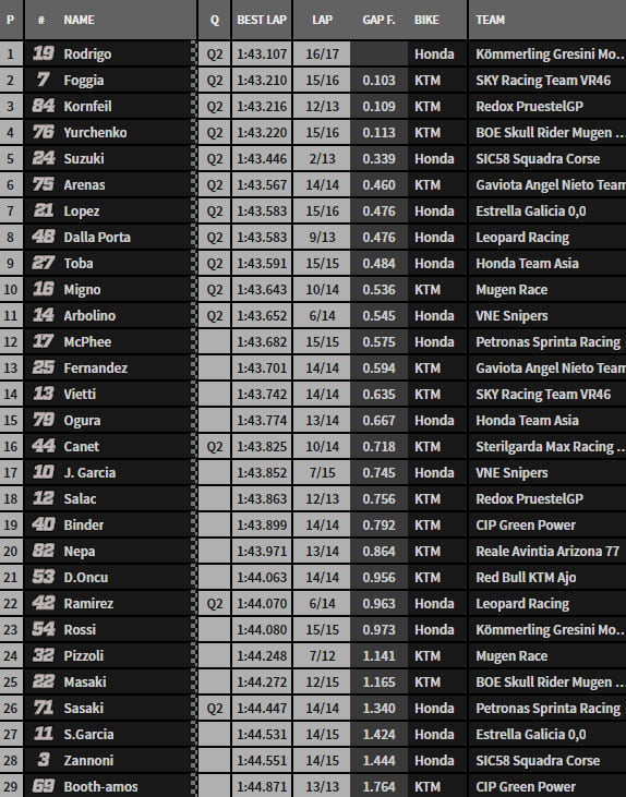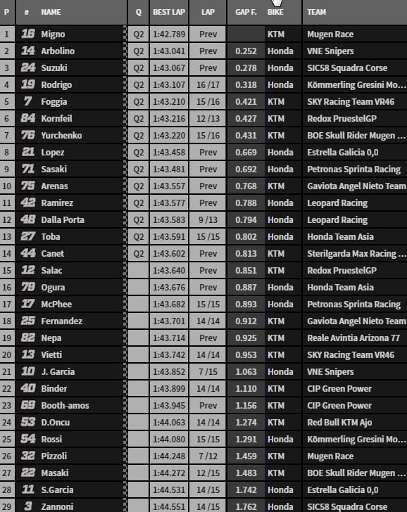 Parmi les quatre remplaçants, on remarque la bonne prestation de Julian Jose Garcia qui remplace provisoirement Romano Fenati au sein du team VNE Snipers, le jeune espagnol roulant dans les mêmes chronos que Tony Arbolino grâce à l’aide de ce dernier.