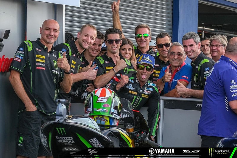 Johann Zarco : « Je suis très heureux. La course a été dure, difficile pour le corps qui devait supporter la chaleur et l’intensité de la course, mais je suis très heureux d’avoir été l’un d’entre eux. Si cela a été dur pour moi, cela a aussi été dur pour eux, et cela me motive aussi pour continuer à attaquer. Je me sentais bien en début de course, mieux que Maverick, mais j’ai commis une erreur quand j’ai essayé de le doubler et j’ai perdu quelques positions. Je pouvais garder le rythme, mais pas assez facilement pour rester et jouer avec eux. Mais j’ai pu donner le meilleur et rester pas loin d’eux, tout en essayant de conserver de l’énergie car la course était très longue. Les choses se sont passées durant la course : Pedrosa était très fort et je pense qu’il avait peut-être la vitesse pour gagner,, mais il a chuté au virage. Dans le même temps, Cal a fait une erreur, donc je l’ai doublé. Rins a aussi pris l’avantage plus ou moins au même moment, puis il est parti pour essayer de rattraper le premier groupe. Je n’ai pas pu rattraper le premier groupe mais je me suis dit « OK, continuer à attaquer car il peut se passer quelque chose ». À la fin, les 4 premiers se sont un peu échappés mais durant les 3 derniers tours, j’ai eu assez d’énergie pour attaquer de nouveau car j’ai vu que je pouvais rattraper Alex. Durant le dernier tour, j’étais très proche de lui et peut-être qu’il ressentait la pression. Il a essayé de fermer la porte pour le virage 9 mais il a un peu élargi. J’ai donc pu le doubler et essayer de bien freiner au dernier virage pour avoir cette 5e place. Il y a 3 Yamaha dans le top 5, donc cela ne veut pas dire que j’ai fait quelque chose d’incroyable, mais nous avons été compétitifs ici. Et immédiatement, quand la moto fonctionne, nous sommes prêts à être au meilleur niveau, et cela procure le sourire à toute l’équipe ».