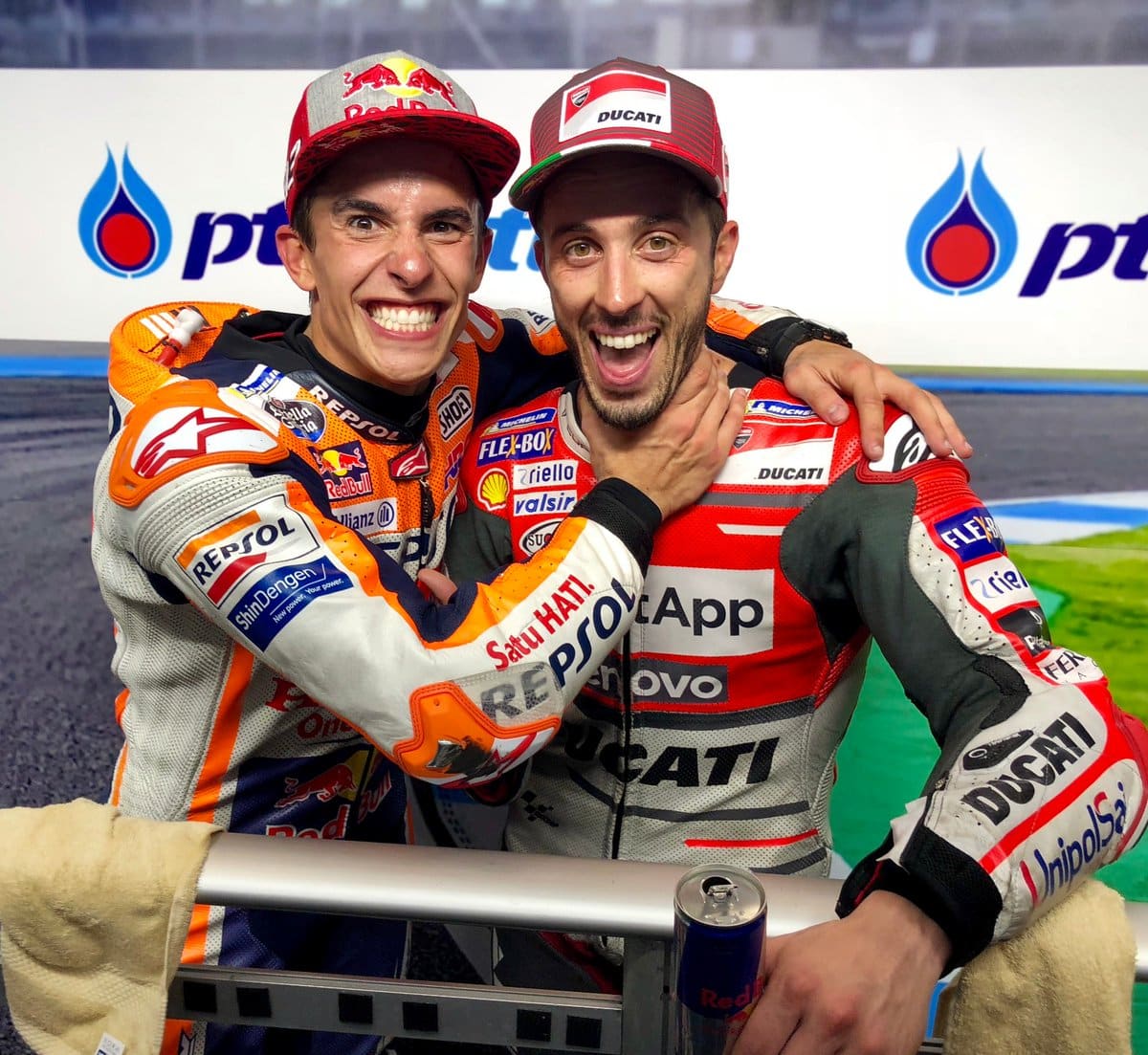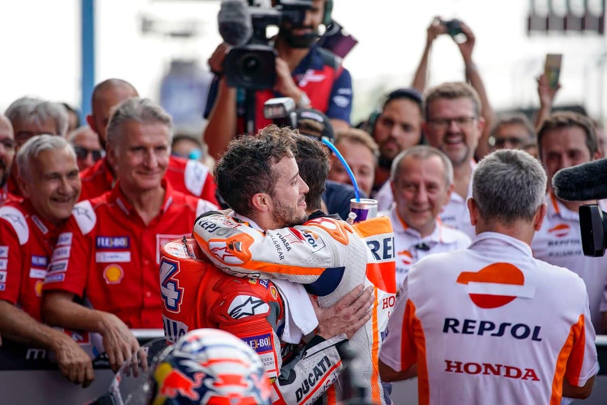 Vous l’aurez remarqué, si Marc Marquez agace par son style et ne s’est pas fait que des amis sur la piste, il n’a jamais eu maille à partir avec Andrea Dovizioso. Et portant, les deux ont croisé le fer bien souvent. A Buriram, ils ont vécu leur quatrième duel pour la victoire jusqu’au dernier virage en quatorze mois. Et à l’arrivée, ils sont tombés dans les bras l’un de l’autre…