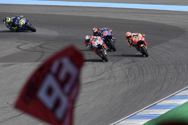 Après la pole position et le record du tour, Márquez décroche ainsi la 68ème victoire de sa carrière, égalant Jorge Lorenzo en terme de victoires dans toutes les catégories : « Je suis très, très content car c’est la première fois que je bats Dovi de cette façon. Nous étions vraiment au même niveau, et ma stratégie était d’essayer d’attaquer afin de créer un écart et l’empêcher de revenir dans le dernier tour. Mais Dovi avait un très bon rythme et j’avais du mal avec mon pneu avant, donc je n’ai pas pu le faire. Au lieu de cela j’ai simplement essayé de gérer les pneus et de rester avec lui. Pour être honnête, je n’étais pas sûr de l’issue de la course à l’entame du dernier tour car j’ai perdu beaucoup de duels sur la ligne d’arrivée face à lui par le passé. Mais cette fois, nous avons inversé les rôles (j’ai utilisé le style de Dovi et Dovi a utilisé le style de Márquez !) et cela a fonctionné pour le doubler dans le dernier virage. C’était génial de rouler devant tous les fans thaïlandais qui soutiennent tous les pilotes de manière égale, apprécient vraiment ce sport et m’ont fait me sentir bien tout au long du week-end. Je les remercie vraiment. A présent, notre première option de titre arrivera au Japon et c’est la course la plus importante pour Honda puisque c’est leur unique Grand Prix à domicile. Nous allons bien évidemment donner le meilleur de nous-mêmes, mais si ce n’est pas possible, l’objectif reste de décrocher le titre au moment opportun. »