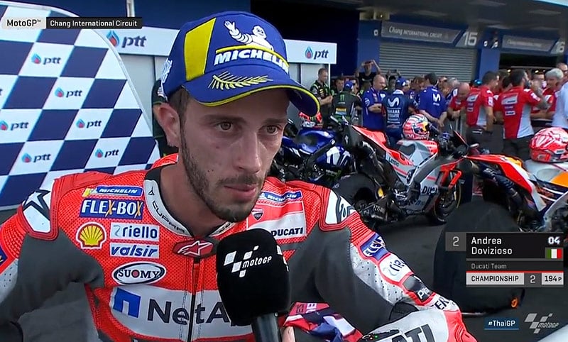 A peine descendu de sa Ducati GP18 officielle après avoir obtenu la 2e place du Grand Prix de Thaïlande, c’est un Andrea Dovizioso satisfait d’avoir été performant sur un circuit qui lui avait rendu la vie difficile lors des tests, mais évidemment un peu déçu de ne pas avoir gagné, qui s’est confié au micro du site officiel MotoGP.com.