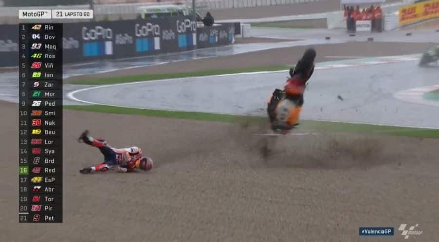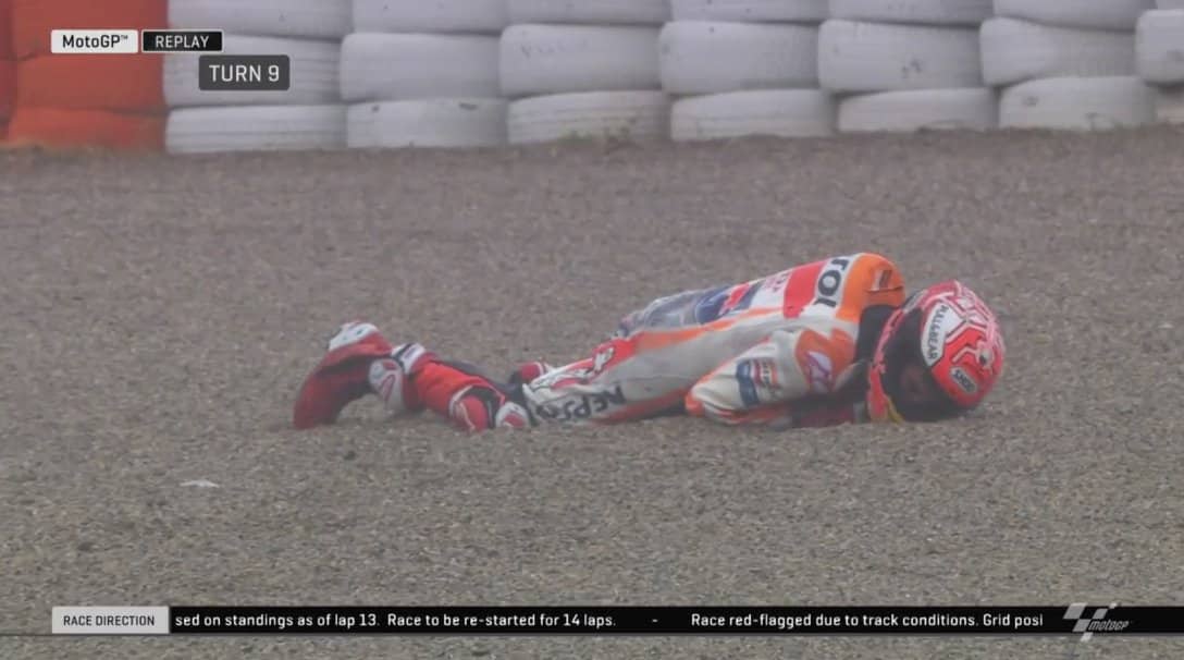 Après sa cabriole, Marquez s’est relevé en tenant son épaule gauche qui avait été déboîtée le samedi après un accident. Sur son état de forme, il précise : « j’ai senti quelque chose à l’épaule, mais c’était dû au choc. Elle ne s’est pas déboîtée. J’ai vérifié. On l’avait bien calée avec un bandage serré. C’était douloureux, mais tout était en place ».