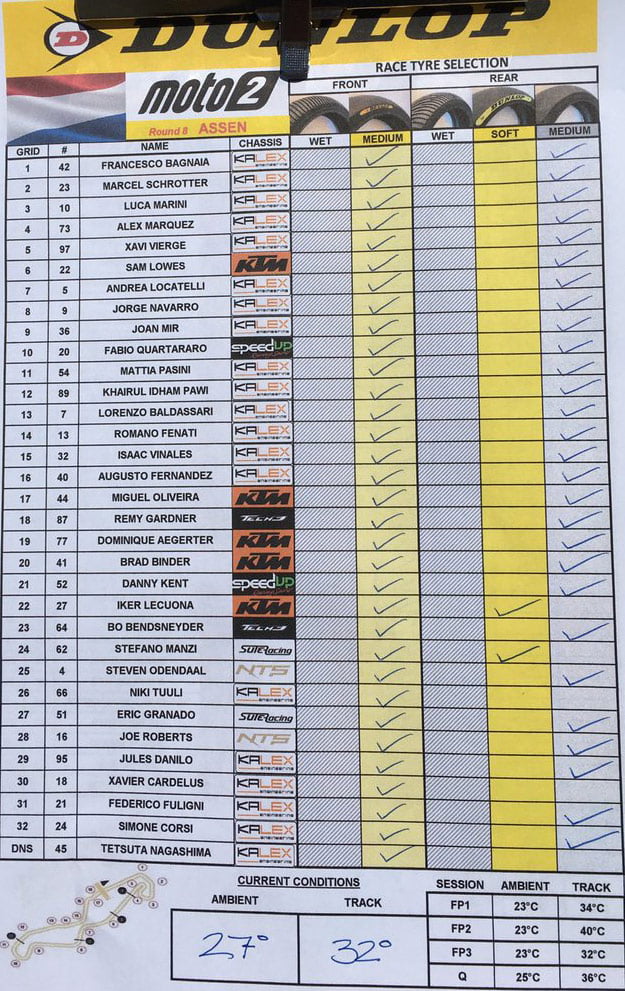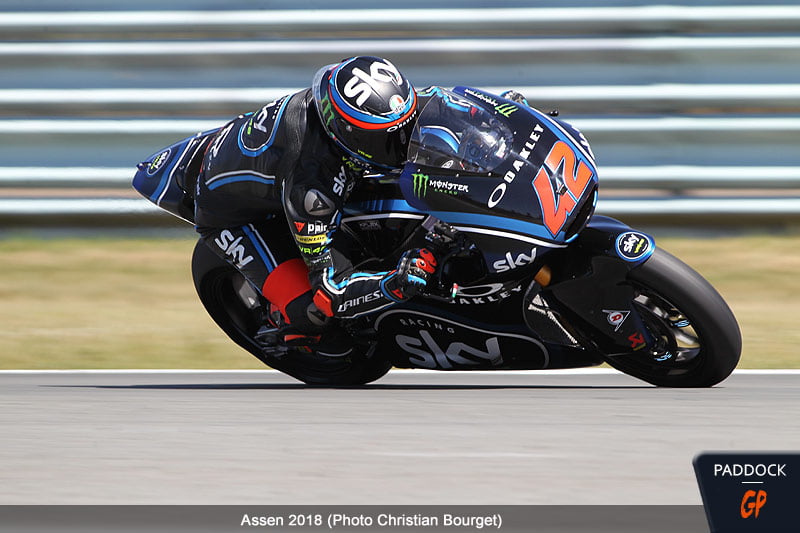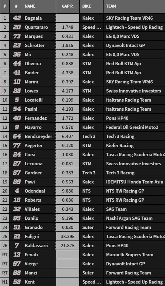 Jusque-là, ce Grand Prix des Pays-Bas est à marquer du sceau d’un Francesco Bagnaia (SKY Racing Team VR46) dont la domination n’a concédé que le Warm Up à un  Marcel Schrotter (Dynavolt Intact GP) qui complétera également la première ligne avec Luca Marini (SKY Racing Team VR46) pour moins d’un dixième de seconde.