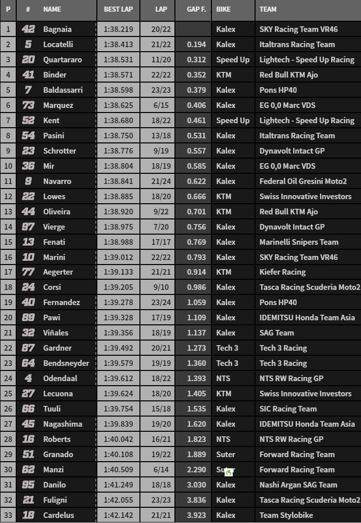 Les chronos descendent rapidement sous la barre des 1’40 alors que 6 pilotes bataillent pour le leadership : Francesco Bagnaia, Alex Márquez, Fabio Quartararo, Mattia Pasini, Marcel Schrotter et Miguel Oliveira.
