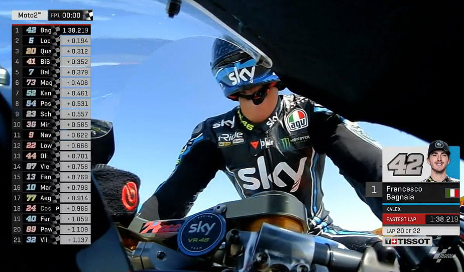 À la fin du premier run, Francesco Bagnaia (1’38.333) précède Fabio Quartararo, Alex Márquez, Marcel Schrotter, Mattia Pasini, Miguel Oliveira, Xavi Vierge, Joan Mir, Jorge Navarro, Danny Kent et Dominique Aegerter, le tout en précisément une seconde.