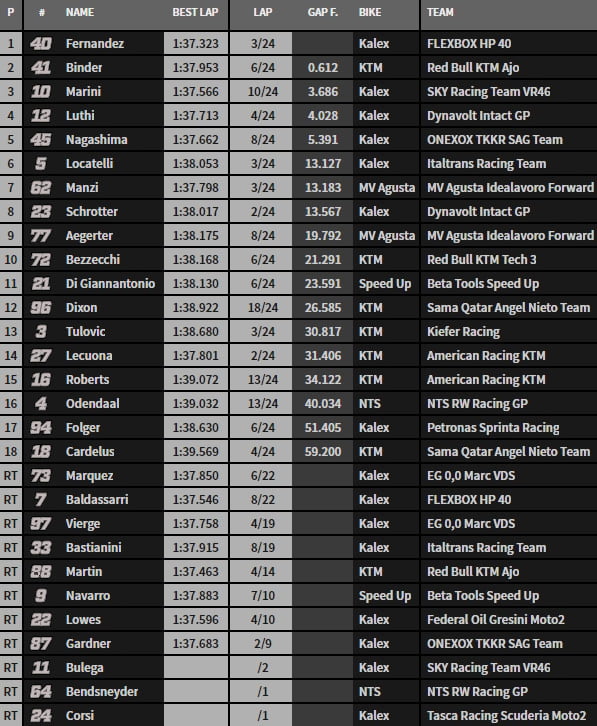 Cela permet un peloton de 7 pilotes de se regrouper : Brad Binder, Sam Lowes, Xavier Vierge, Augusto Fernández (Kalex, Flex-Box Pons HP 40), Álex Márquez, Remy Gardner, Tom Lüthi et Jorge Martin (KTM, Red Bull KTM Ajo).