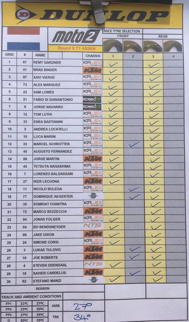 | QP2 | 1’37.608 Francesco Bagnaia | 1’36.572 Remy Gardner |