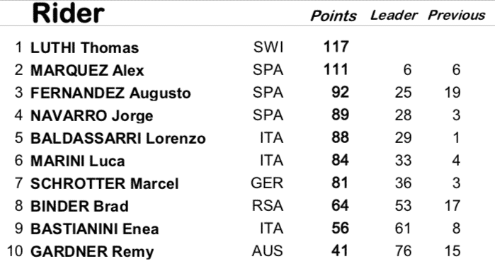 Au classement général, Tom Lüthi prend la tête avec 117 points devant Álex Márquez, victime d’un accrochage avec Lorenzo Baldassarri. Augusto Fernández s’empare de la troisième place du classement, à 25 points du leader.