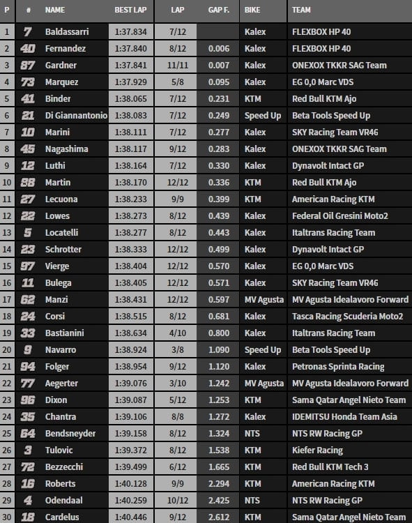 On en restera là avec un Baldassarri qui retrouve le moral. Son équipier Fernandez suit comme Gardner, Le trio de tête est en 7 millièmes… Álex Márquez pointe quatrième et Binder qui met la KTM dans le top 5.