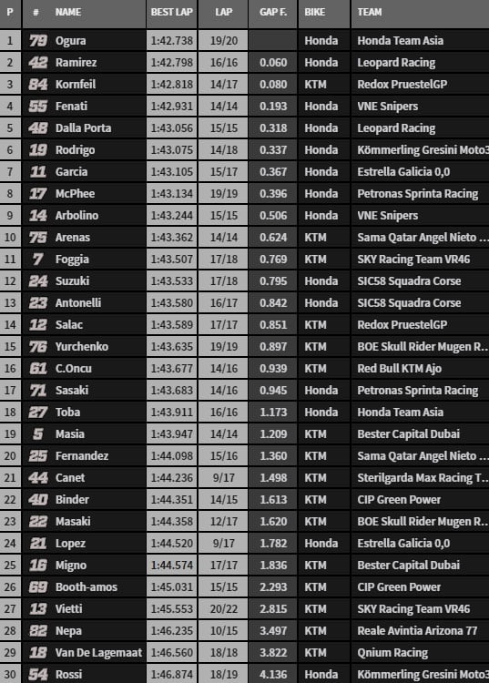 C’est Ai Ogura qui en fin de séance, s’approprie le meilleur temps de la séance en 1.42.738s devant Marcos Ramirez, du team Leopard et Jakub Kornfeil. Romano Fenati termine avec le quatrième chrono en 1.42.931s.