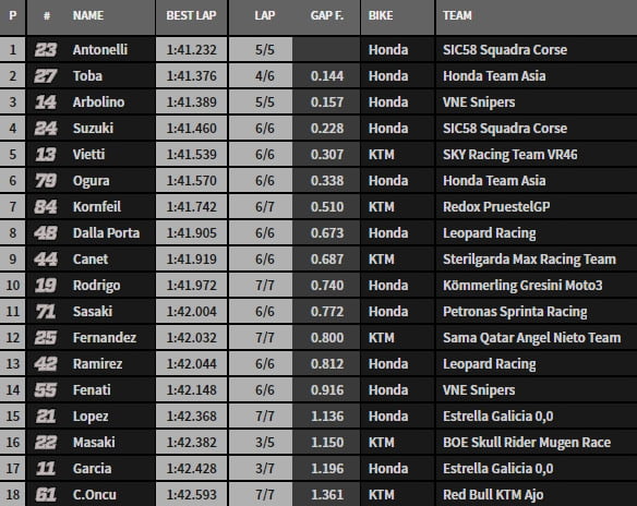 Pour l »assaut final, les deux pilotes Leopard roulent à nouveau de concert, comme lors de la Q1. Pour quel résultat ? Masaki chute au virage 1. Il était huitième. Mais Antonelli reste sur ses roues et signe la pole en 1’41.232. C’est le nouveau record de la piste qui tenait depuis 2015 avec Bastianini. Toba suit et la première ligne est fermée par Arbolino. Suzuki, Vietti et Ogura seront sur la seconde. Dalla Porta est huitième juste devant Canet. Les quatre premiers sont en Honda.