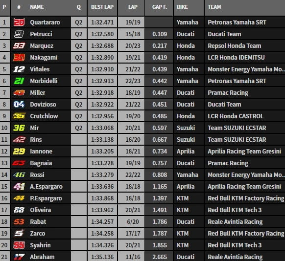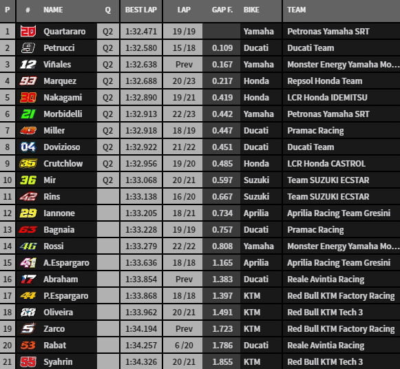 Dans ces conditions optimales, Maverick Viñales, Fabio Quartararo, Danilo Petrucci, Andrea Dovizioso, Álex Rins, Andrea Iannone, Marc Márquez, Joan Mir, Valentino Rossi et Cal Crutchlow se sont pré-qualifiés pour la Q2, même si certains, à l’image de Marc Márquez, ne doivent leur relativement moyenne position qu’à une stratégie de travailler avant tout pour la course.