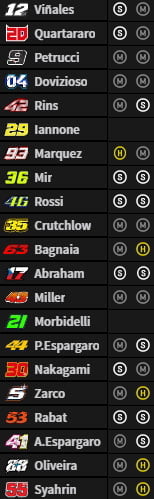 Valentino Rossi est alors 15e, Cal Crutchlow 16e, Pol Espargaró 17e et Johann Zarco 18e.