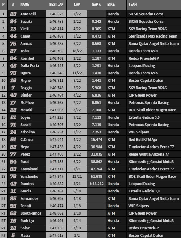 Suzuki mène toujours après trois tours devant Dalla Porta qui lui prend les commandes avant l’abord du quatrième. Antonelli est troisième devant Canet, McPhee est sixième. Au quatrième tour, Vietti s’installe en tête. Huit pilotes roulent en paquet en tête et c’est Kornfeil qui ferme le groupe. Il est rejoint par Ramirez et Foggia.