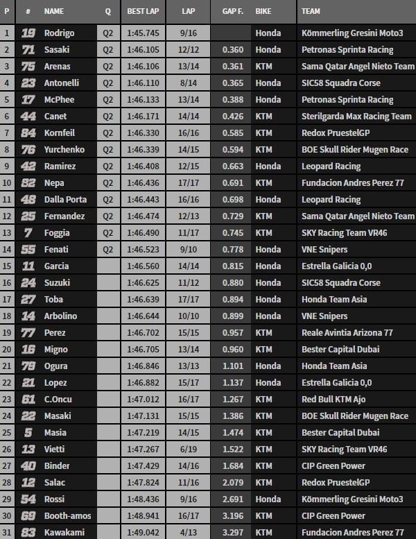 Au final, Rodrigo rafle la mise devant Sasaki, Arenas, Antonelli et McPhee. Canet est sixième. Fenati se sauve de justesse puisque le voilà quatorzième. Suzuki devra en passer par la Q1 comme Toba et Masiá seulement 25è.