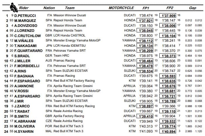 Petrucci terminait magnifiquement la journée en première position en 1’37.909, devant Márquez et ses 1’37.921. Ils précédaient Andrea Dovizioso et Cal Crutchlow, soient deux Ducati en bagarre contre trois Honda.