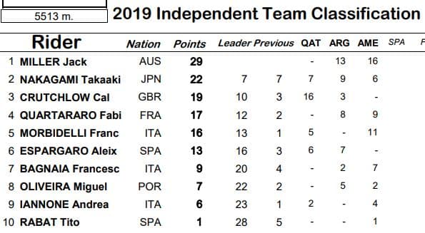 Nul doute que Miller aimerait bien améliorer ses statistiques. Avec sa troisième place à Austin, Jack est monté sur le podium pour la première fois depuis qu’il a remporté le Grand Prix des Pays-Bas à Assen en 2016. Miller mène maintenant le classement des coureurs de l’équipe indépendante avec 29 points, devant Takaaki Nakagami (22).