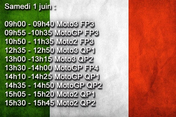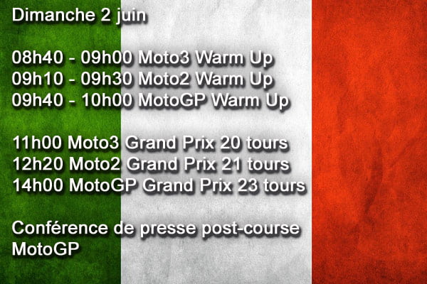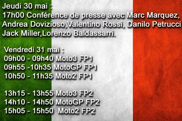 Les horaires de ce Grand Prix d’Italie restent habituels pour un Grand Prix Européen et la traditionnelle conférence de presse du jeudi a accueilli Marc Márquez (SPA-Honda), Andrea Dovizioso (ITA-Ducati), Valentino Rossi (ITA-Yamaha), Danilo Petrucci (ITA-Ducati), Jack Miller (AUS-Ducati) et le leader du championnat Moto2 Lorenzo Baldassarri (ITA-Kalex).