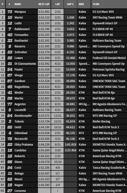 À l’issue du premier tour, Lüthi mène devant Schrötter, Alex Márquez, Luca Marini (Kalex, SKY Racing Team VR46) et Jorge Navarro tandis que Sam Lowes (Kalex, Federal Oil Gresini Moto2) emmène le groupe de chasse.