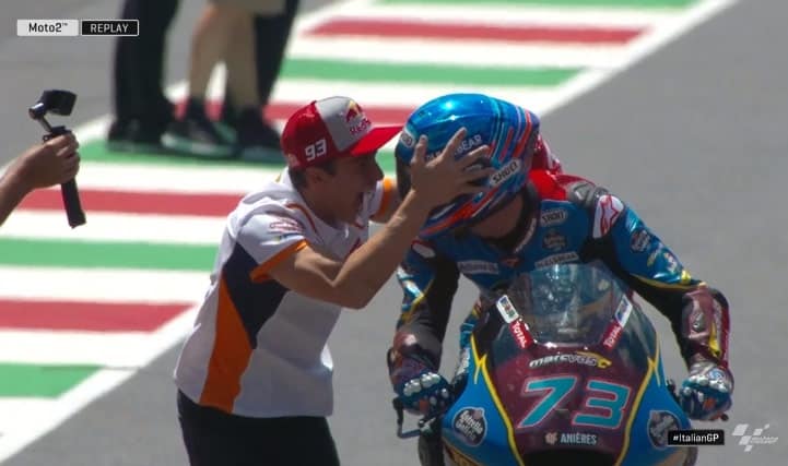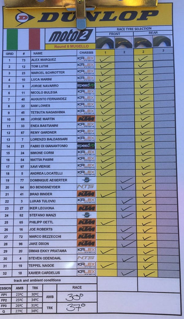 Qualifié seulement en 15e position pour ce Grand Prix d’Italie au Mugello, le pilote italien n’est donc pas à l’abri d’un renversement de situation d’autant que la première ligne de la grille de départ est constituée par Marcel Schrötter, Tom Lüthi et Álex Márquez