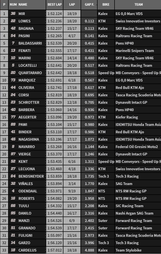 Francesco Bagnaia vient alors renforcer les positions italiennes en s’emparant de la 2e place à la fin d’un premier run hiérarchisé comme tel : Pasini, Bagnaia, Márquez, Locatelli, Lowes, Oliveira, Schrotter, Fenati, Marini et Mir.