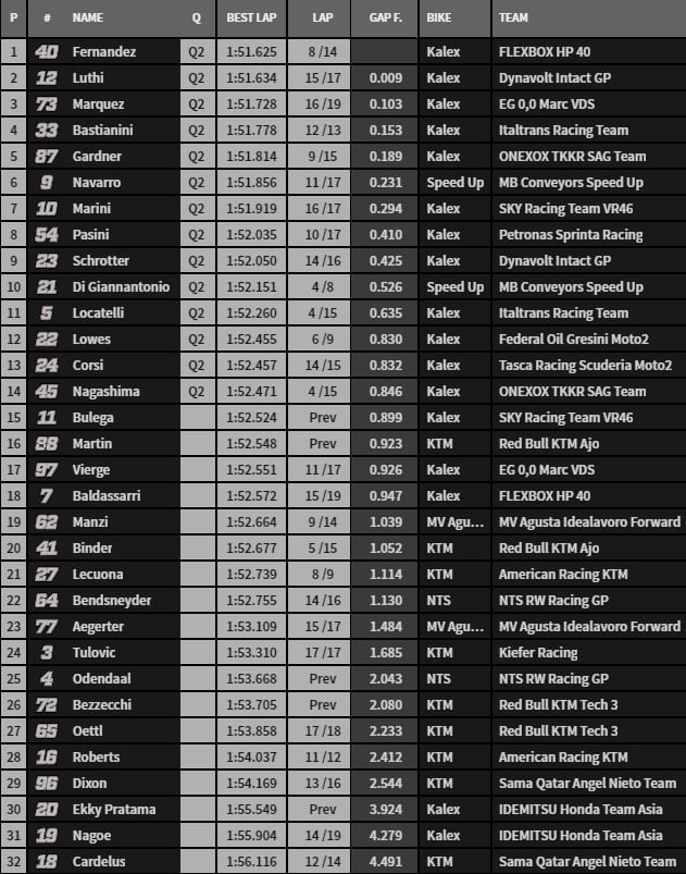 A ce stade de la séance, aucune KTM n’est en Q2… Il reste cinq minutes. Joe Roberts chute. Il était 26è. Au final, Fernández garde l’avantage sur Lüthi pour 9 millièmes. Álex Márquez, Bastianini et Gardner suivent. Navarro maîtrise Marini, tandis que Pasini, Schrötter et Di Giannantonio ferment le top 10. Nagashima est le dernier qualifié pour la Q2 alors qu’en Q1, on trouvera le leader du championnat Baldassarri et toutes les KTM…