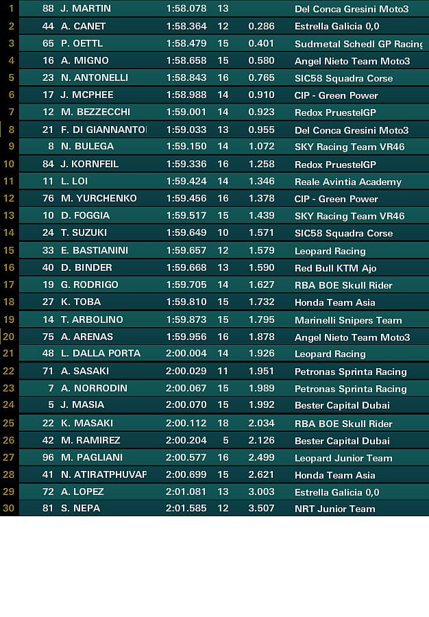 A mi-séance, Jorge Martín (Del Conca Gresini) a naturellement pris la tête du classement, et ce depuis quelques minutes déjà. Avec son 1’59.200, nous sommes encore loin du meilleur chrono réalisé par Romano Fenati lors de la FP1 de l’an dernier, mais la séance n’est pas terminée. Le pilote espagnol devance Niccolò Antonelli (SIC58 Squadra Corse), Philipp Oettl (Sudmetal Schedl GP Racing), Arón Canet et Fabio Di Giannantonio. Derrière, Tatsuki Suzuki, Andrea Migno (Ángel Nieto Team Moto3), Marco Bezzecchi (PruestlGP), John Mcphee (CIP – Green Power) et Marcos Ramírez complètent le top 10.