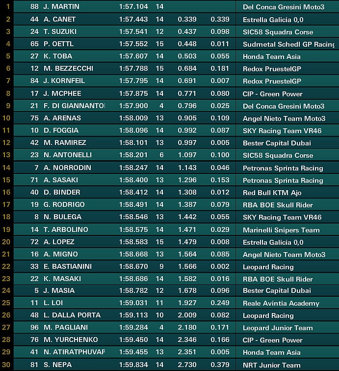 Dans les trois dernières minutes, Jorge Martín repasse devant son coéquipier, puis tout le monde améliore : Philipp Oettl prend la tête du classement, immédiatement détrôné par Arón Canet (Estrella Galicia 0,0), avant que Martín ne reprenne le commandement, et n’améliore encore son propre chrono dans son dernier tour.