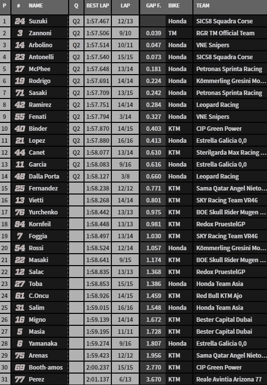 Arbolino, Antonelli et McPhee ferment le top 5. Fenati est neuvième. Canet 12è. Dalla Porta tient la 14è place qui est la dernière qualificative pour la Q2. Les déceptions sont Masiá et Migno anonymes 26 et 27è et qui sont équipiers chez Nieto.
