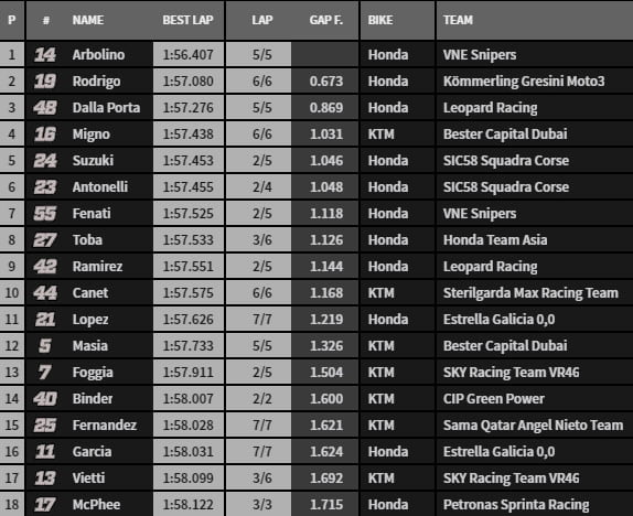 A trois minutes du terme, les fauves sont lâchés. Pour quel verdict ? Arbolino ! Avec le nouveau record de la piste en 1’56.407. C’est presque sept dixième de mieux que Rodrigo, Dalla Porta ferme la première ligne. Migno, Suzuki et Antonelli seront sur la seconde rangée. Fenati est septième, Canet dixième, Masiá douzième et McPhee 18è.