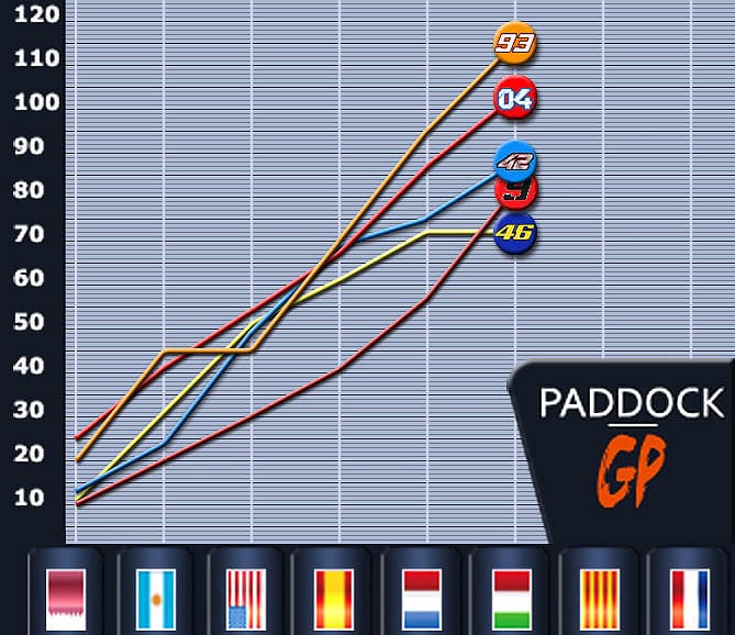 103 points pour Dovizioso et 115 pour Marc Márquez, la différence est donc de 12 unités. Rins est troisième avec 88 points soit seulement six de plus que Petrucci qui fait le carton plein avec 25 points marqués. Rossi avec ses 72 points ajoutés à rien ce dimanche décroche…