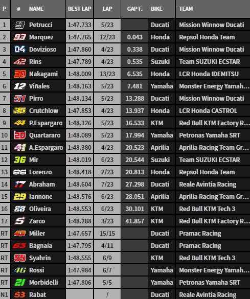 Deux tours… Le dernier tour est entamé avec Márquez en tête… Petrucci contre attaque… En manquant faire tomber Dovi ! C’est lui qui rafle la mise devant Márquez et Dovizioso. Rins suit de très près. Nakagami est cinquième, Quartararo dixième Lorenzo treizième. Zarco dernier. Au championnat, Márquez fait la bonne affaire, cette victoire Ducati ne servira à rien, au contraire…