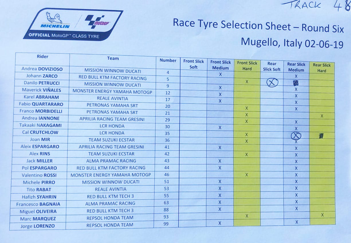 30°dans l’air et 51° sur la piste, le soleil a fait de ce qu’il faut pour accueillir chaleureusement les pilotes pour 23 tours de course. Márquez est full hard et Quartararo en hard medium comme Rossi. Petrucci est en full medium comme Dovizioso. Morbidelli est en full hard. Zarco est en hard soft. C’est le seul à prendre ce pneu tendre comme le montre le tableau ci-dessous…