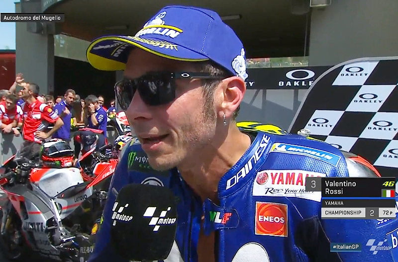 A peine descendu de sa Yamaha M1 officielle, encore tout à sa joie d’avoir obtenu la troisième place du Grand Prix d’Italie à domicile, Valentino Rossi s’est confié au micro du site officiel MotoGP.com.